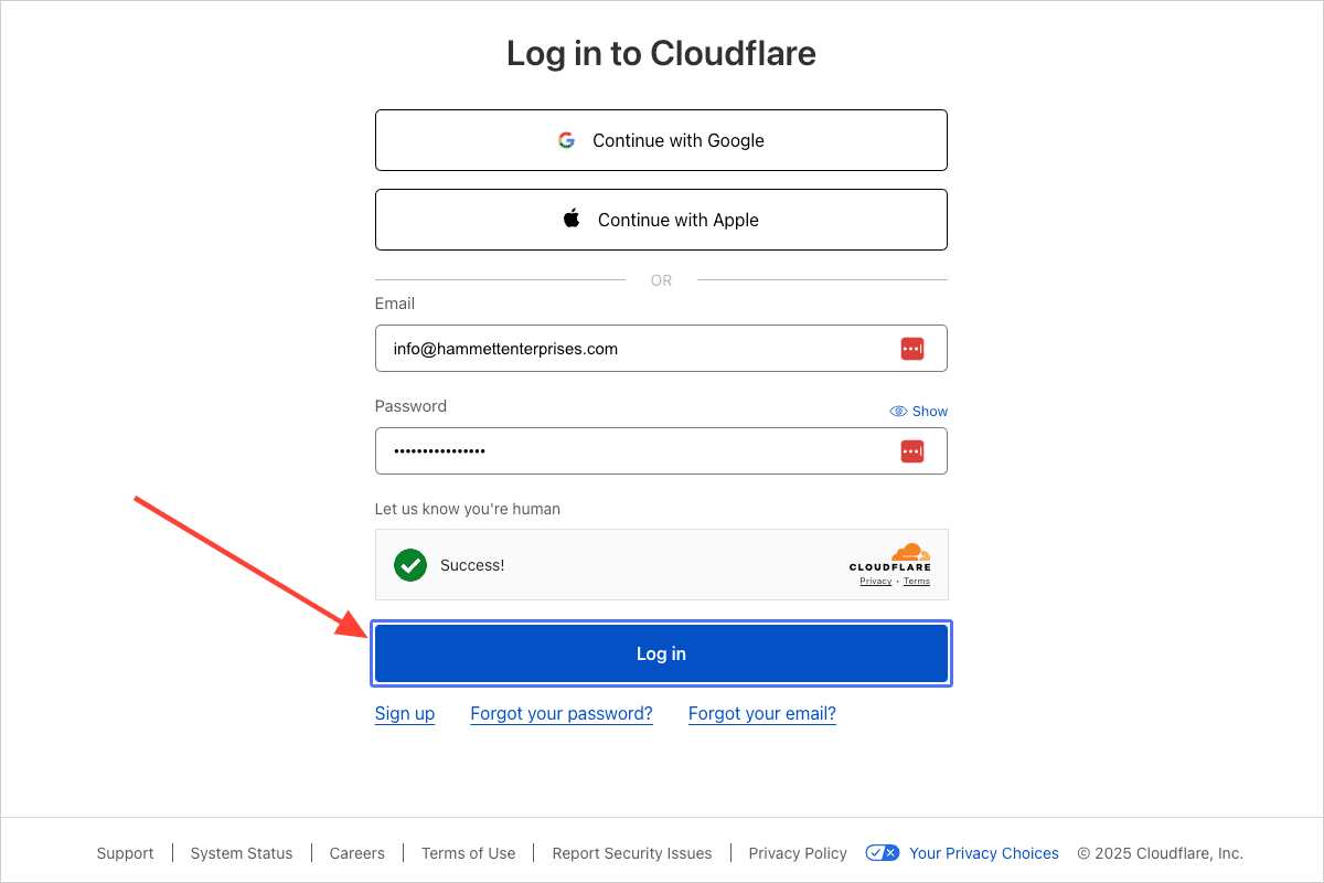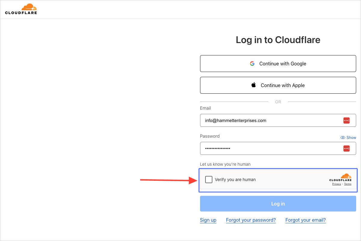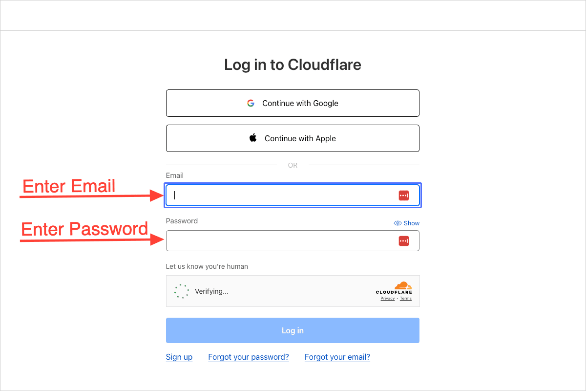 If LastPass is active, it may automatically populate the fields depending on the browser. Simply click the form input, and a LastPass dialog will appear with the Cloudflare login credentials, allowing you to autofill the email address and password.